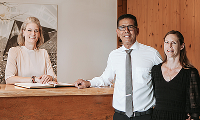 Andrea Schlumpf (Rezeption), Hédi Challakh (Gastgeber) und Isabelle Bucher (Backoffice)